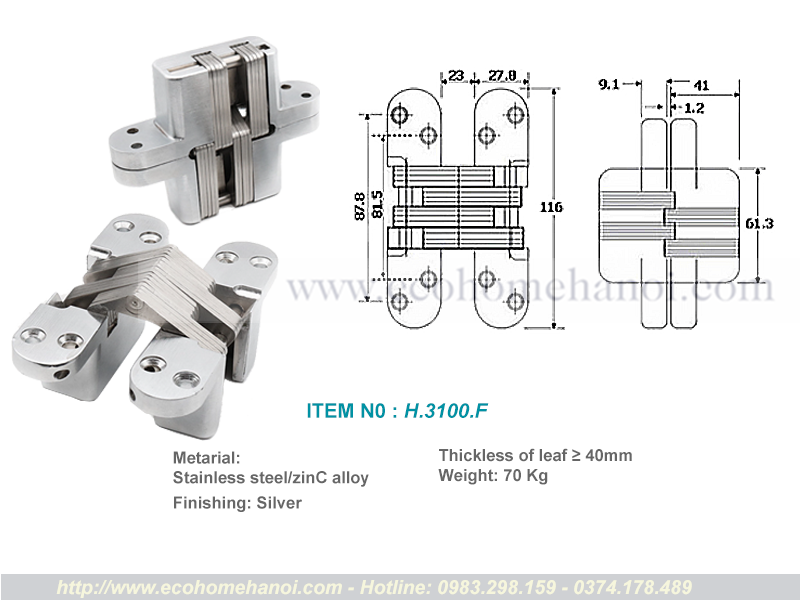 Được gia công từ thép không gỉ và hợp kim kẽm, bản lề H.3100 đảm bảo độ bền cơ học cao, chống mài mòn, chống gỉ sét và hoạt động ổn định theo thời gian. Bản lề được chia thành nhiều mã theo khả năng chịu tải và độ dày cánh khác nhau – dễ dàng lựa chọn theo nhu cầu thực tế.