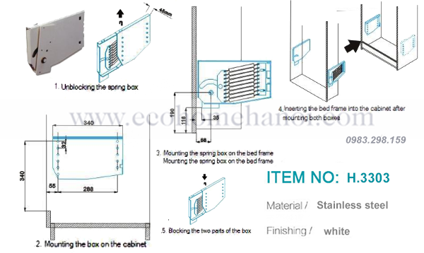 – Mã sản phẩm: H.3303– Đặc tính sản phẩm:Cơ chế lực lò xo tạo momen xoắn hỗ trợ nâng giường nhẹ nhàng hơn. Với 9 lò xo kết hợp áp dụng cho giường kích thước 1,5-2m.Lực nâng có thể tăng chỉnh bằng bu lông căng lò xo.Chất liệu thép sơn tĩnh điện màu trắng độ bền cao và tính thẩm mỹ cho sản phẩm.