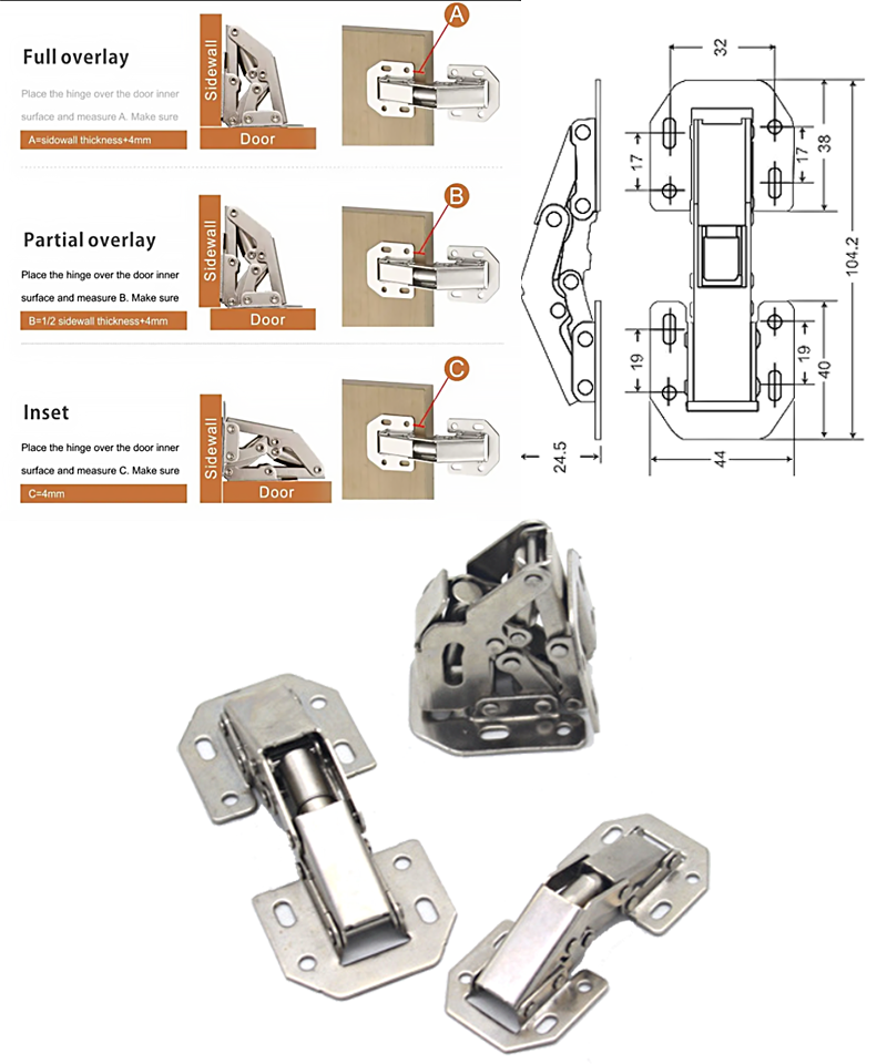 Bản lề không khoét lỗ H.3400 (Bản lề ếch) là giải pháp thi công nội thất thông minh, giúp bạn lắp đặt cánh tủ dễ dàng mà không cần dụng cụ khoan khoét lỗ chuyên dụng.