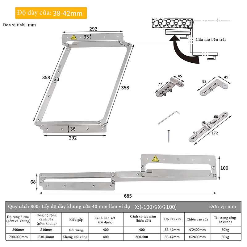 Để đảm bảo cửa hoạt động trơn tru, việc tuân thủ các thông số kỹ thuật là bắt buộc. Hệ thống YG291 được thiết kế linh hoạt cho nhiều kích thước cửa: