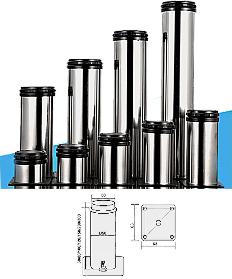 Đường kính thân trụ: $D = 50mm$ (Phi 50). Kích thước này tạo cảm giác đầm chắc, không quá to thô kệch nhưng đủ vững chãi để đỡ các loại tủ nặng như tủ bếp hay sofa văng dài.