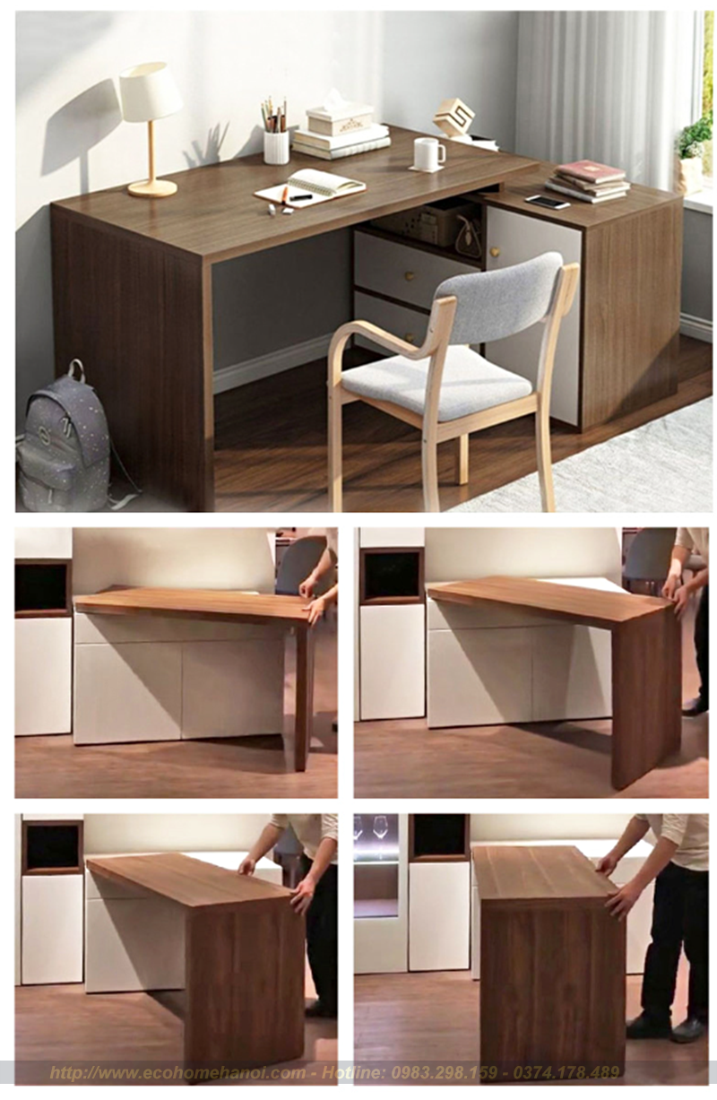 Hệ trục xoay linh hoạt (xoay trái hoặc phải tuỳ theo nhu cầu) kết hợp với bánh xe giúp bàn có thể xoay ra – thu gọn vào dễ dàng, tiết kiệm diện tích tối đa. -