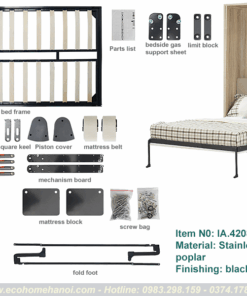 | Phụ kiện đi kèm | Chân giường, Đai giữ đệm, Bản lề trục quay, Ốc vít lắp đặt |