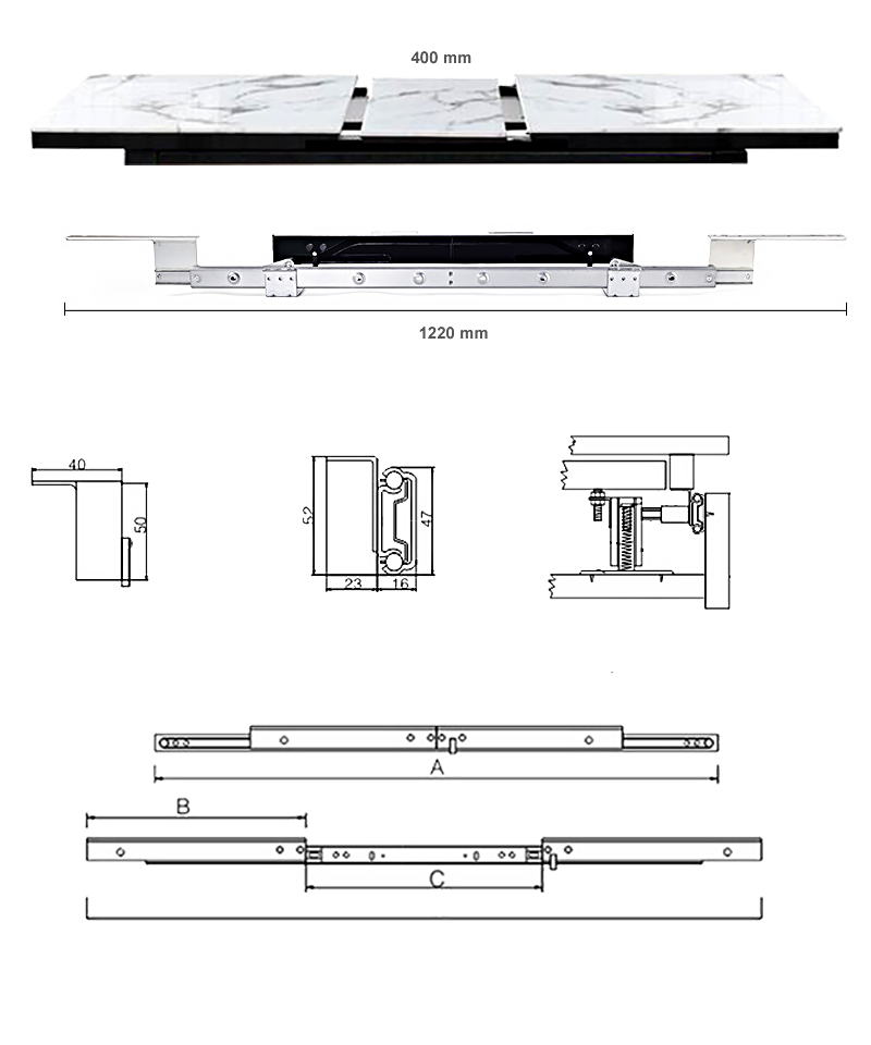 Kích thước: Dài 1220mm, phần nâng mở rộng giữa: 400mm