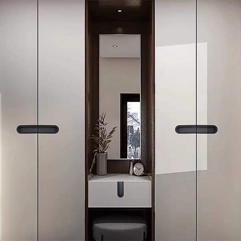 Khi lắp hoàn thiện, mặt tay nắm sẽ nằm phẳng với bề mặt tủ, không gây nhô ra ngoài.