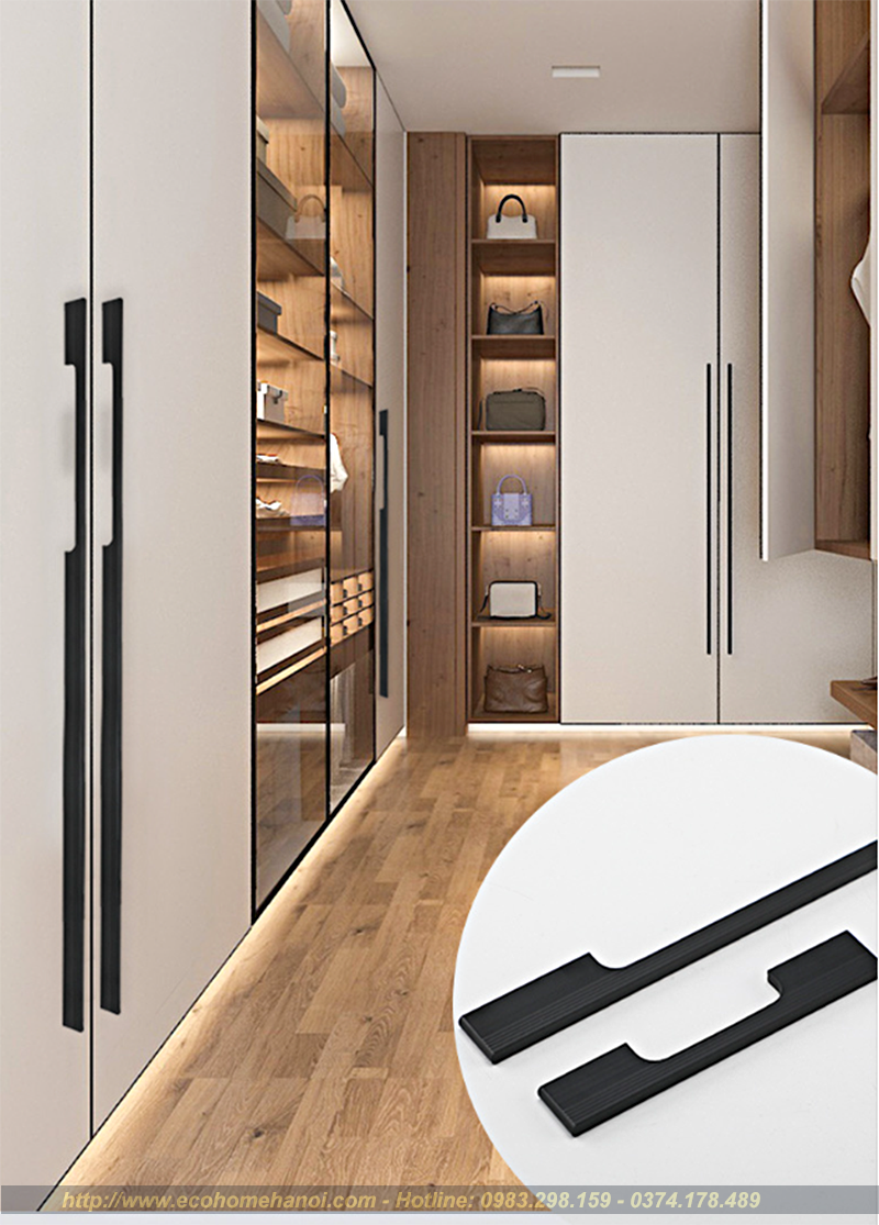 Lợi ích: Thanh tay nắm dài 1 mét chạy dọc theo cánh tủ tạo hiệu ứng thị giác mạnh mẽ, giúp “kéo dài” chiều cao của căn phòng, làm cho trần nhà trông cao và thoáng hơn. Ngoài ra, tay nắm dài giúp cả người lớn và trẻ em đều có thể mở cửa dễ dàng ở bất kỳ độ cao nào mà không cần với hay cúi.