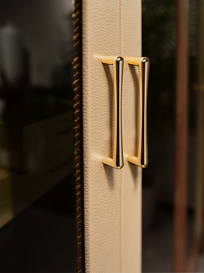 Tủ quần áo (Wardrobe): Tay nắm mạ vàng dài chạy dọc cánh tủ áo không chỉ giúp đóng mở dễ dàng mà còn như một đường viền trang trí, giúp cánh tủ bớt đơn điệu.
