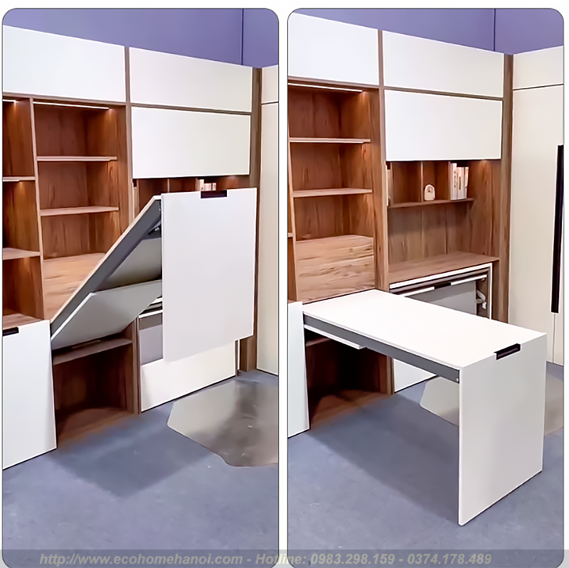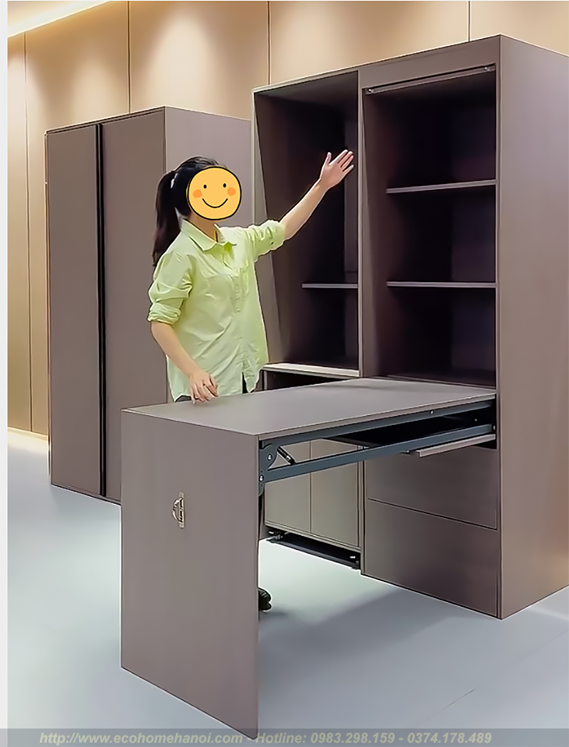 Thiết kế thông minh: Gập lên thành cánh tủ, gập xuống thành bàn – linh hoạt sử dụng.